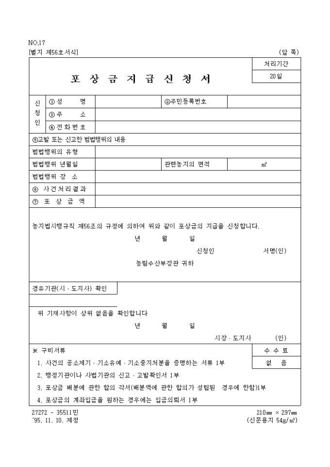 9,000원/월농지법시행규칙 제56조의 규정에 의하여 위와 같이 포상금의 지급을 신청하고자 할 때 사용하는 포상금 지급신청서 양식입니다.