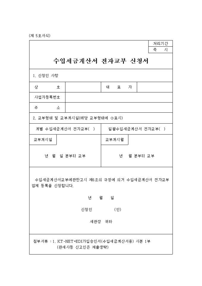 9,000원/월제 5호 수입세금계산서 전자교부 신청서2003.2.4 서식입니다. 수입세금계산서교부에관한고시 제6조의 규정에 의거 수입세금계산서 전자교부업체 등록을 신청합니다. 첨부서류 명시되어있습니다.