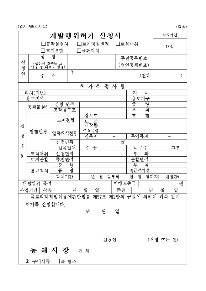 9,000원/월국토의 계획 및 이용에 관한 법률 제57조 제1항의 규정에 의하여 개발행위(공작물 설치, 토지형질 변경, 토석채취, 토지분할, 물건적치)의 허가를 득하고자 할 때 쓰이는 개발 행위 허가신청서 양식입니다.