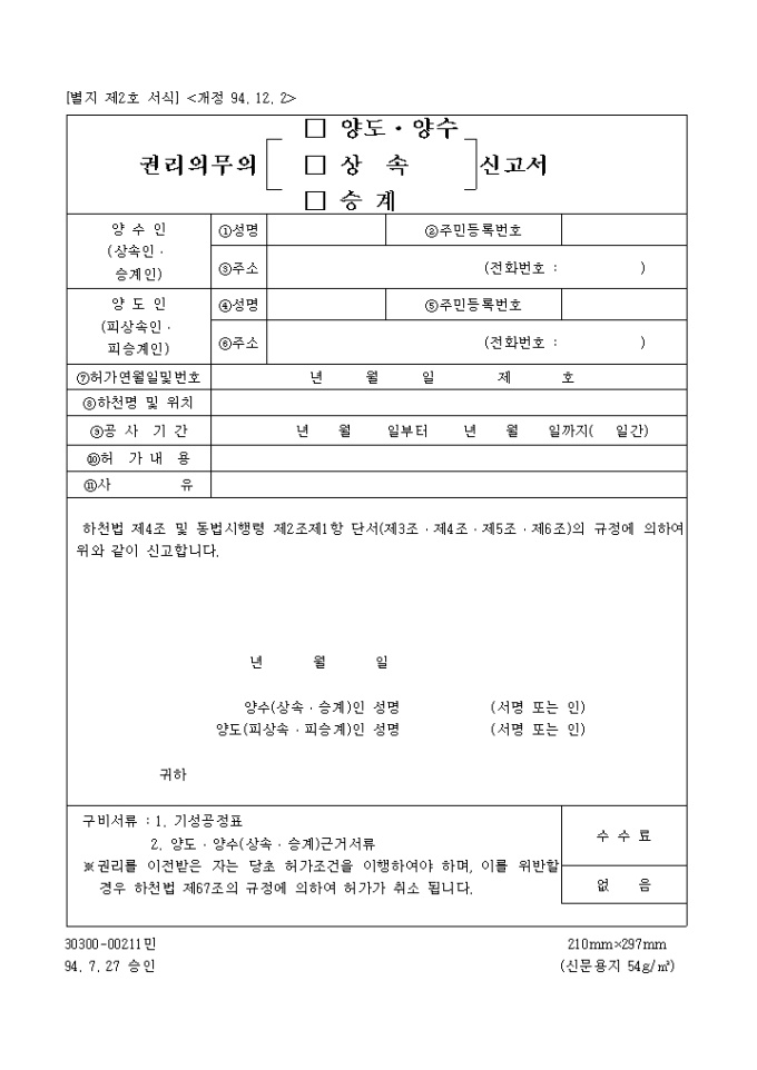 9,000원/월[별지 제2호 서식] 권리의무의 양도,양수,상속,승계 신고서 양식입니다. 하천법 제4조 및 동법시행령 제2조제1항 단서(제3조·제4조·제5조·제6조)의 규정에 의하여 위와 같이 신고하실때 사용하는 양식입니다.