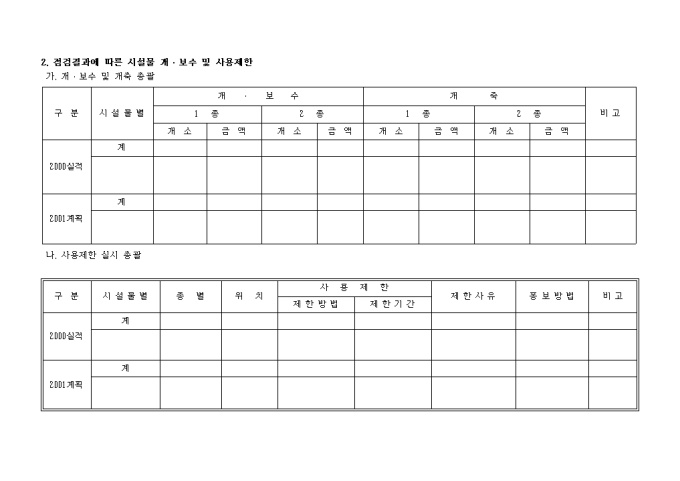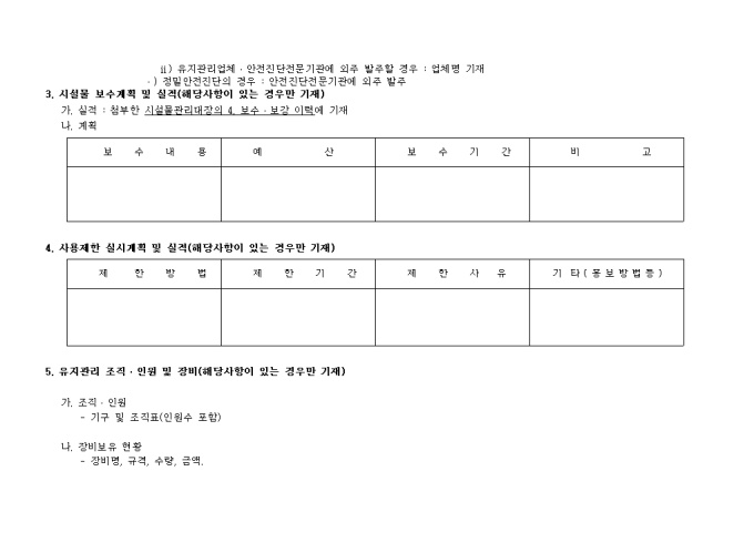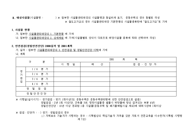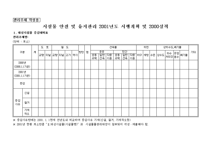 9,000원/월안전및유지관리시행계획서식 양식입니다. 1. 계획수립현황 및 점검(진단)실시 실적 2. 점검결과에 따른 시설물 개·보수 및 사용제한 시설물 안전 및 유지관리 2001년도 시행계획 및 2000실적 Ⅰ. 대상시설물 증감대비표 1. 시설물 현황 2. 안전점검(정밀안전진단) 2000실적 및 2001계획 3. 시설물 보수계획 및 실적(해당사항이 있는 경우만 기재) 4. 사용제한 실시계획 및 실적(해당사항이 있는 경우만 기재) 5. 유지관리 조직․인원 및 장비(해당사항이 있는 경우만 기재) ..