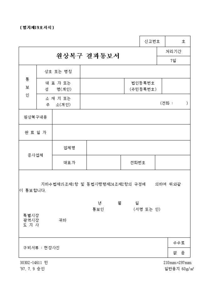9,000원/월〔별지제19호서식〕 원상복구 결과통보서 양식입니다. 지하수법제15조제1항 및 동법시행령제24조제2항의 규정에 의하여 위와같이 통보하실때 사용하는 양식입니다.