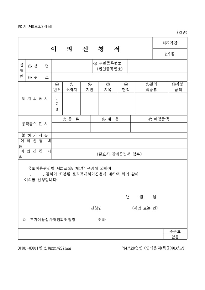 9,000원/월[별지 제8호의3서식] 이의신청서 양식입니다. 국토이용관리법 제21조의5 제1항 규정에 의하여 . . . 불허가 처분된 토지거래허가신청에 대하여 위와 같이 이의를 신청합니다.