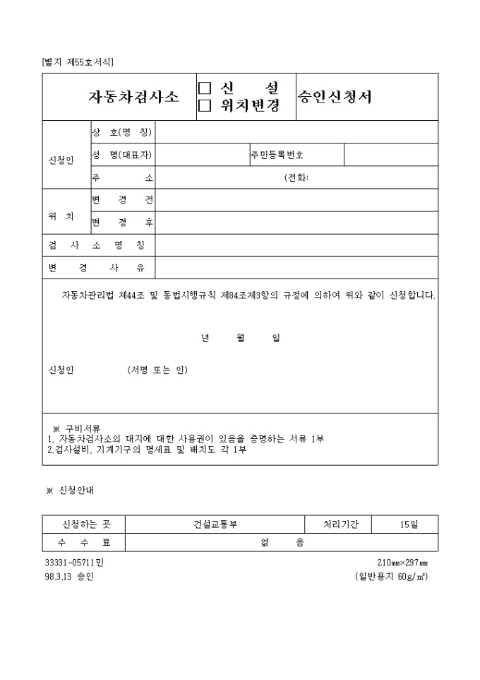 9,000원/월[별지 제55호서식] 자동차검사소 신설,위치변경 승인신청서 양식입니다. 자동차관리법 제44조 및 동법시행규칙 제84조제3항의 규정에 의하여 위와 같이 신청하실때 사용하는 양식입니다.