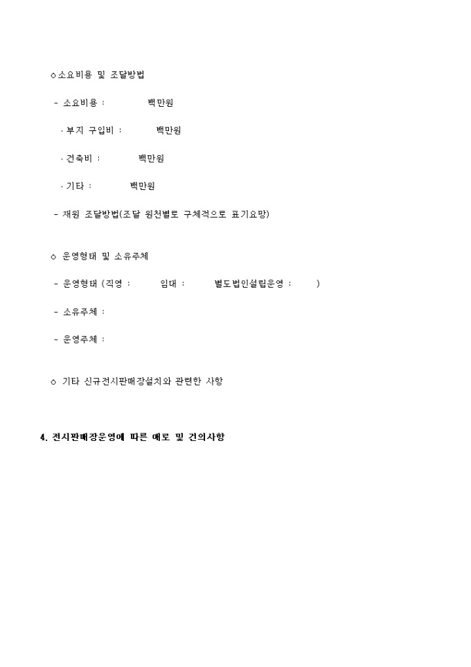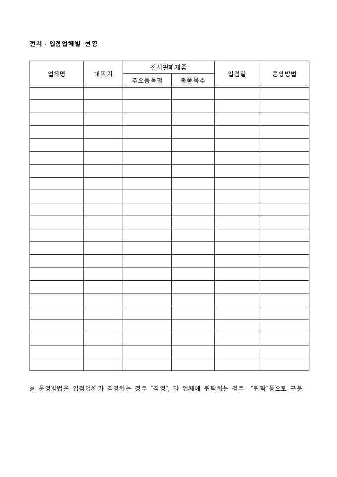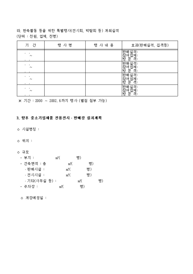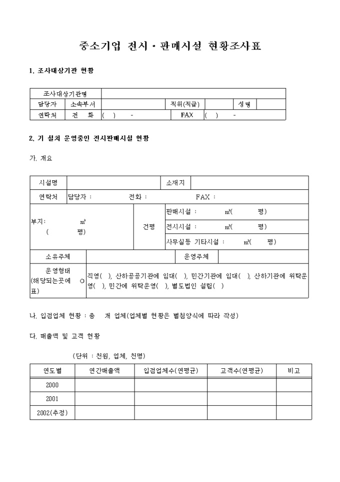 9,000원/월중소기업 전시 판매시설 현황조사표 양식입니다. -목 차- 1. 조사대상기관 현황 2. 기 설치 운영중인 전시판매시설 현황 3. 향후 중소기업제품 전용전시·판매장 설치계획 4. 전시판매장운영에 따른 애로 및 건의사항 전시·입점업체별 현황