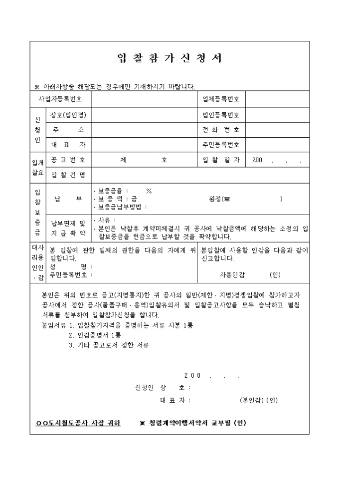 9,000원/월입찰참가 신청서 양식입니다. 본인은 위의 번호로 공고(지명통지)한 귀 공사의 일반(제한․지명)경쟁입찰에 참가하고자 공사에서 정한 공사(물품구매․용역)입찰유의서 및 입찰공고사항을 모두 승낙하고 별첨 서류를 첨부하여 입찰참가신청을 합니다. ...