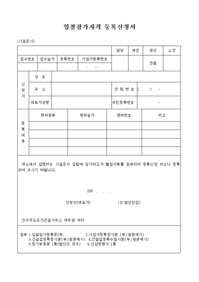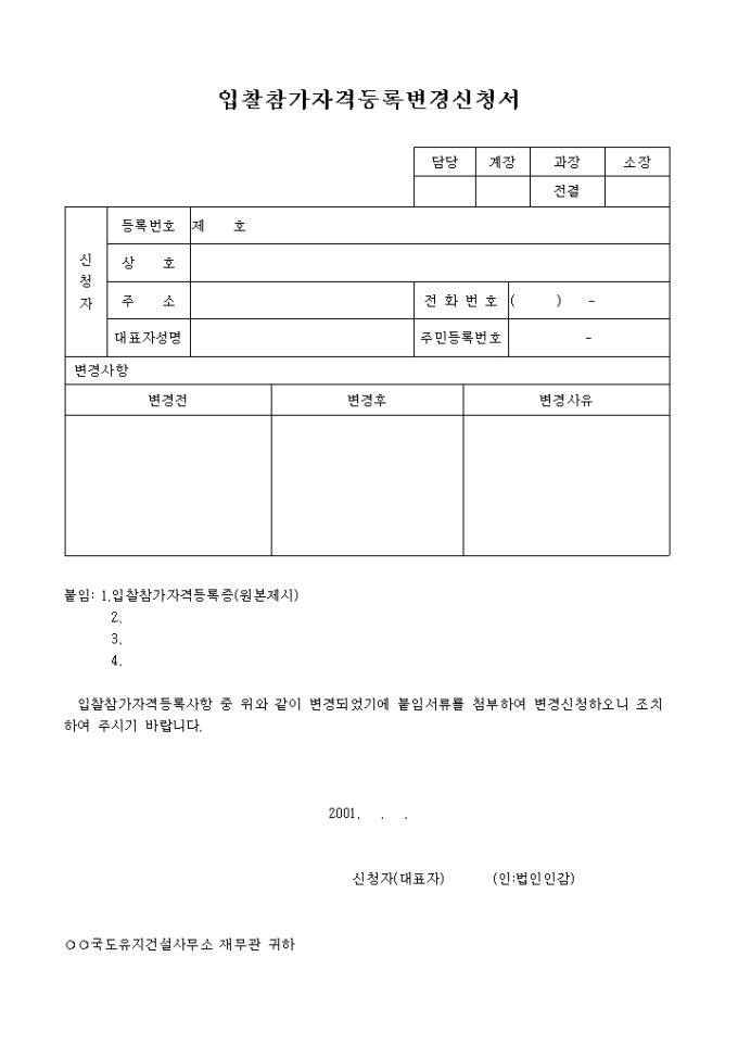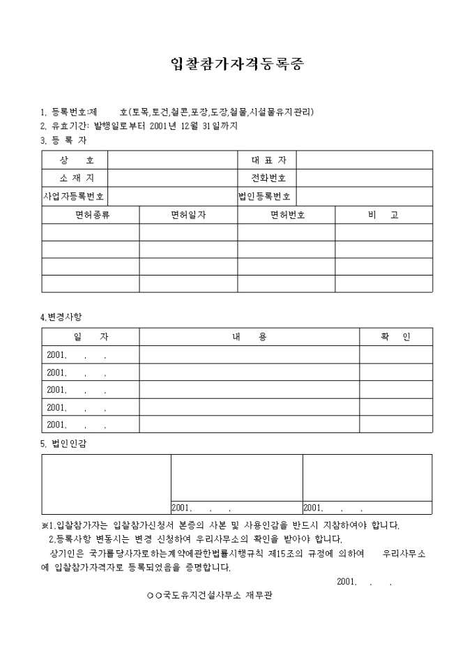 9,000원/월등록번호, 유료기간, 등록자 인적사항, 변경사항, 법인인감을 기록하는 입찰참가신청서입니다.