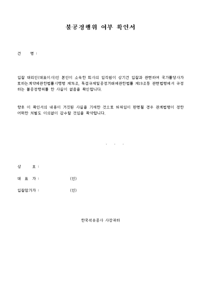 9,000원/월불공정행위 여부 확인서 양식입니다. 입찰 대리인(대표이사)인 본인이 소속한 회사의 임직원이 상기건 입찰과 관련하여 국가를당사자로하는계약에관한법률시행령 제76조, 독점규제및공정거래에관한법률 제19조등 관련법령에서 규정하는 불공정행위를 한 사실이 없음을 확인합니다. 향후 이 확인서의 내용이 거짓된 사실을 기재한 것으로 허위임이 판명될 경우 관계법령이 정한 어떠한 처벌도 이의없이 감수할 것임을 확약합니다. ...