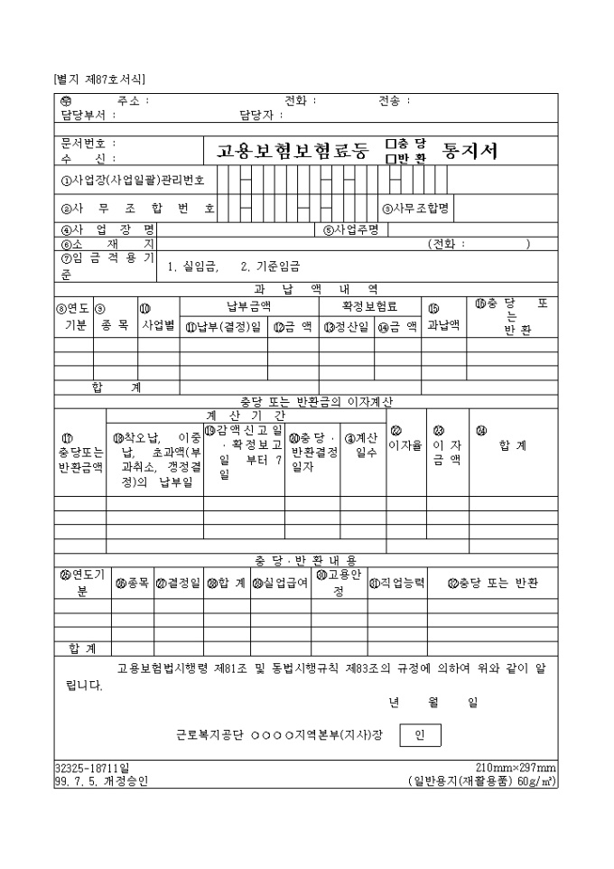 9,000원/월[별지 제87호서식] 고용보험법시행령 제81조 및 동법시행규칙 제83조의 규정에 의하여 고용보험 보험료등 충당(반환)통지할 때 사용하는 양식입니다.