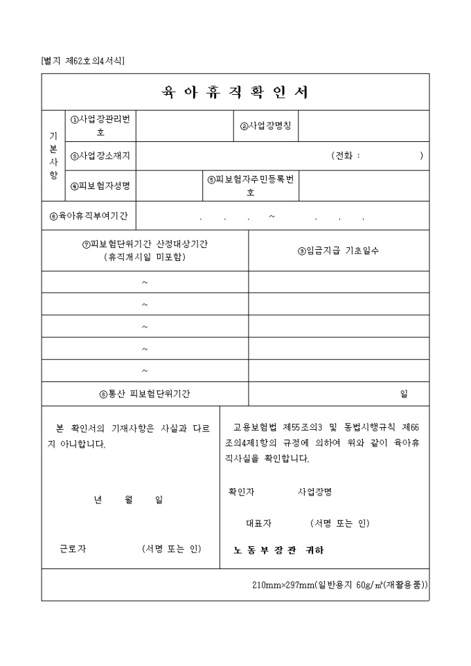 9,000원/월육아휴직확인서[제62호의4서식] 양식입니다. 고용보험법 제55조의3 및 동법시행규칙 제66조의4제1항의 규정에 의하여 위와 같이 육아휴직사실을 확인하실때 사용하는 양식입니다.