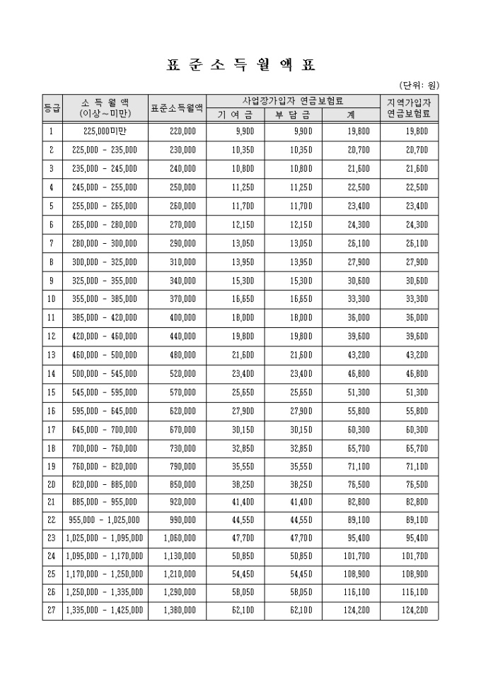 9,000원/월표준소득월액표 예제 양식입니다. 등급별 소득월액, 표준소득원액, 사업상가입자, 지역가입자로 구성된 예제 양식입니다.