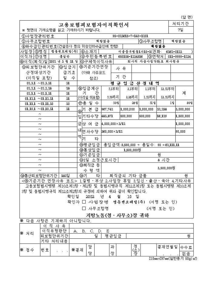 9,000원/월피보험자이직확인서(고용보험) 예제 양식입니다. 고용보험법시행령 제10조제1항·제2항 및 동법시행규칙 제12조제1항 또는 동법시행령 제10조제3항 및 동법시행규칙 제12조제2항의 규정에 의하여 위와 같이 확인하실때 사용하는 양식입니다.