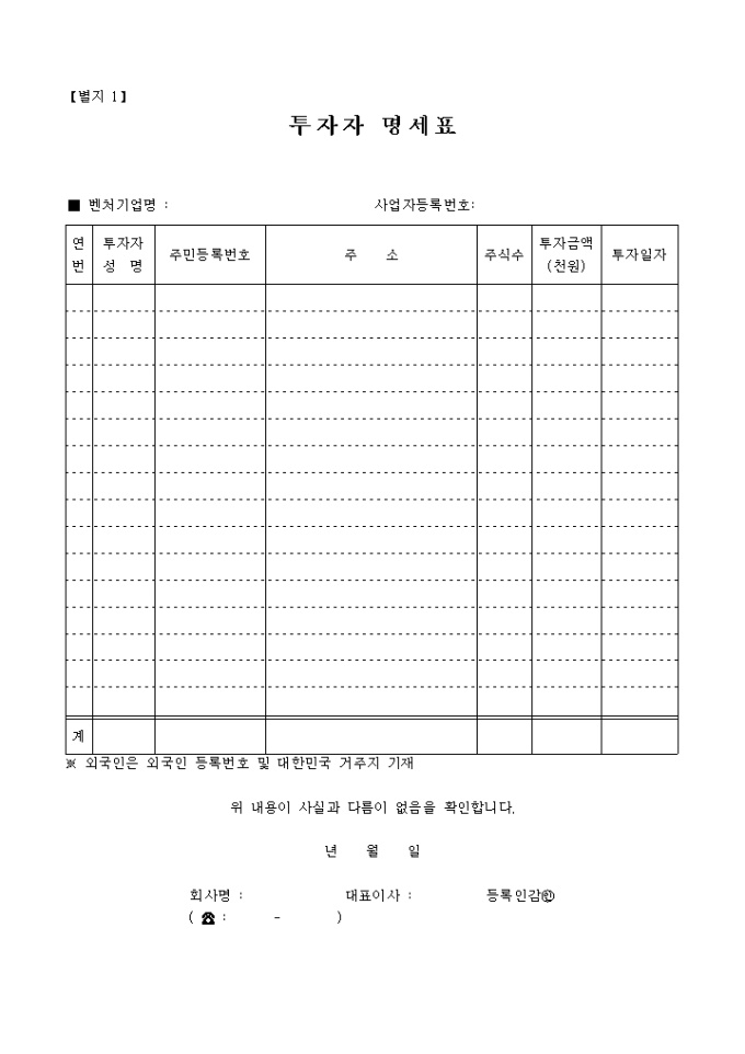 9,000원/월투자자 명세표 양식 예제입니다. 일개의 벤처기업에 관한 (연번, 투자자 성명, 주민등록번호, 주소, 주식수, 투자금액, 투자일자)의 구성으로 이루어진 투자자 명세표 양식입니다.