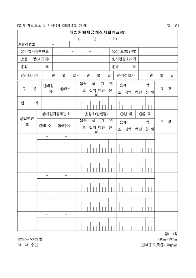 9,000원/월2001년 4월 3일 개정된 매입처별세금계산서합계표(갑) 별지20호의3서식(1)입니다. 매입처수,매수,공급가액,세액,상호,업태,종목등으로 구성된 양식입니다.