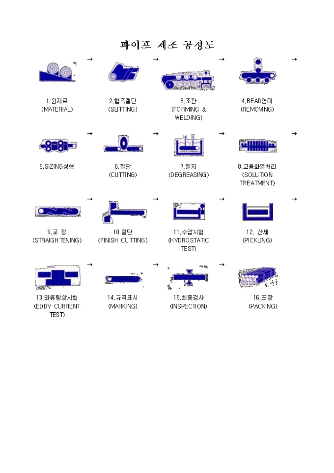 9,000원/월원재료,협폭절단,조관,BEAD연마 등의 공정순서가 그림으로 나와있는 파이프 제조 공정도입니다.
