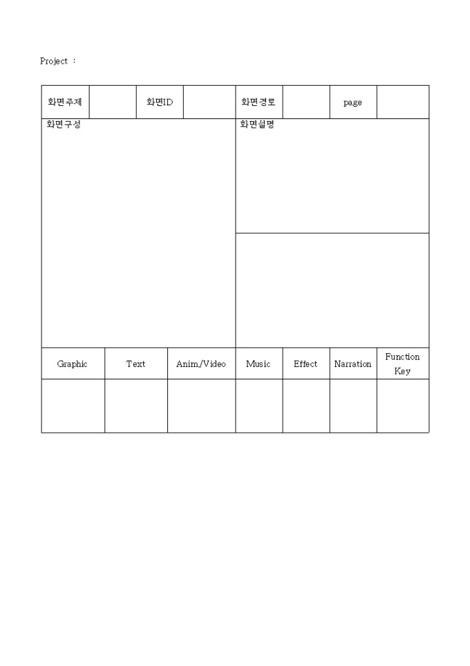 9,000원/월소토리보드 양식입니다. 다음과 같은 구성으로 되어 있습니다. 1.프로젝트명 2.페이지 번호 3.화면주제 4.화면ID 5.화면경로 6.화면구성 7.화면설명 ...