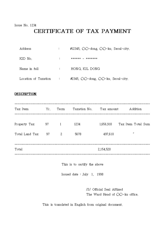 9,000원/월세목별 과세 증명원2 영문 양식 예제입니다. ........... This is to certify the above Issued date : July 1, 1998 /S/ Official Seal Affixed The Ward Head of Seocho-ku office. This is translated in English from original document.