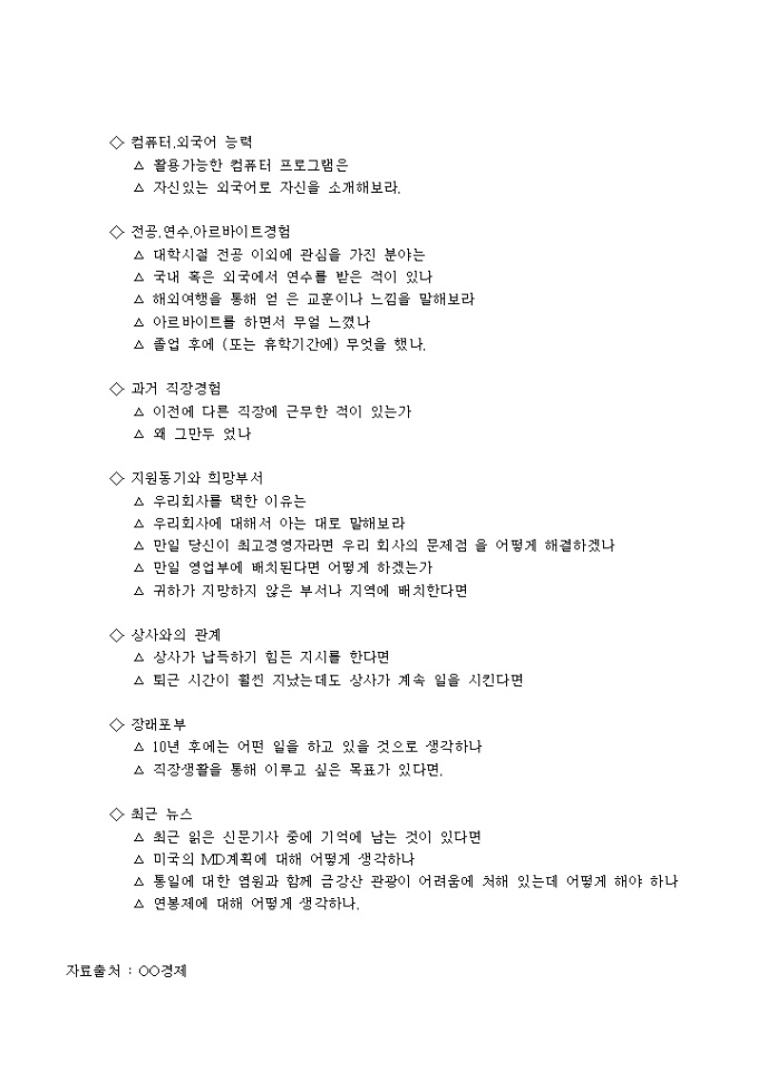 9,000원/월면접 주요 예상질문에 관한 내용이 게재되어 있습니다. 내용중 일부분입니다. 취업희망 인력에 비해 취업문이 좁다보니 서류전형과 필기시험에 이어 면접까지도 5대1 이상은 기본이다. 그 만큼 취업관문을 뚫기가 어려워 졌다는 얘기로 대학학점이나 필기 시험 성적이 좋아도 면접에서 높은 점수를 얻지 못하면 사실상 취업은 불가능하다. 허를 찌르는 면접관의 질문도 있겠지만 질문의 유형이 비슷하다는 점에서 사전에 충분한 준비를 기울이면 보다 우수한 면