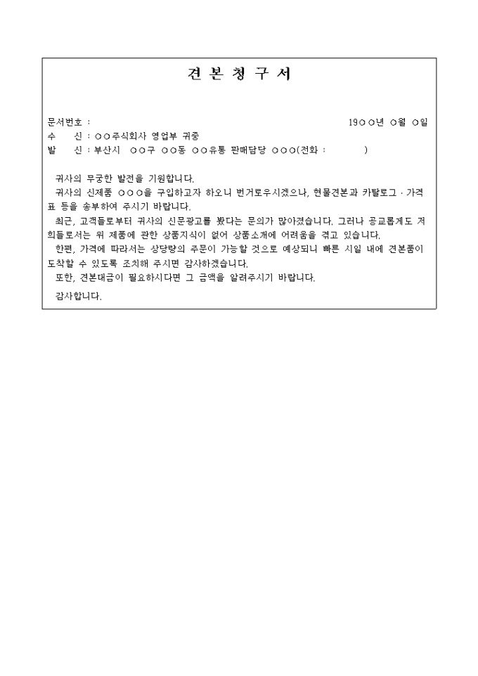 9,000원/월견본청구서 양식 예제입니다. ............ 귀사의 무궁한 발전을 기원합니다. 귀사의 신제품 ○○○을 구입하고자 하오니 번거로우시겠으나 , 현물견본과 카탈로그 가격표 등을 송부하여 주시기 바랍니다. 최근, 고객들로부터 귀사의 신문광고를 봤다는 문의가 많아졌습니다. 그러나 공교롭게도 저희들로서는 위 제품에 관한 상품지식이 없어 상품소개에 어려움을 겪고 있습니다. 한편, 가격에 따라서는 상당량의 주문이 가능할 것으로 예