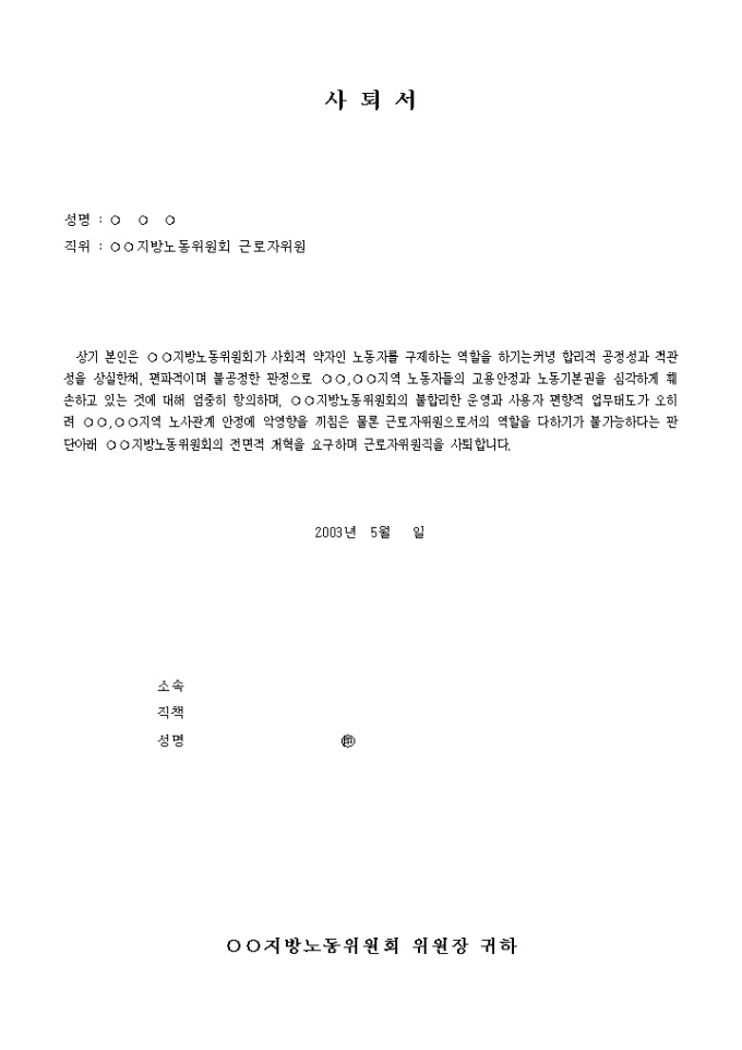 9,000원/월지방노동위원회 근로자위원 사퇴서 예제 양식입니다.