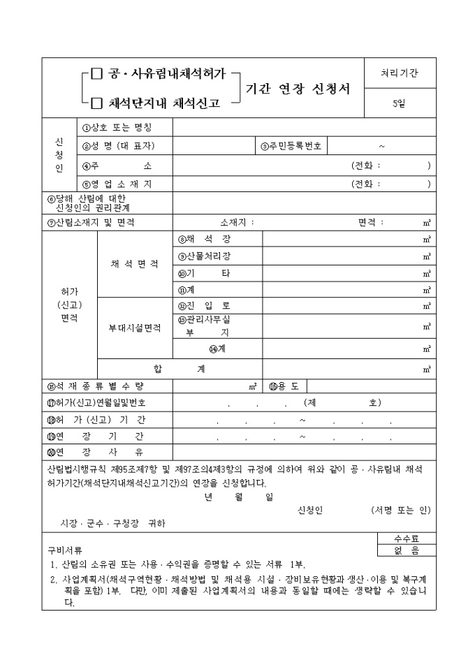 9,000원/월산림법시행규칙 제95조제7항 및 제97조의4제3항의 규정에 의하여 위와 같이 공․사유림내 채석허가기간(채석단지내채석신고기간)의 연장을 신청할 때 쓰는 '(공, 사유림내 채석허가, 채석단지 내채석 신고)기간 연장신청서' 양식입니다.