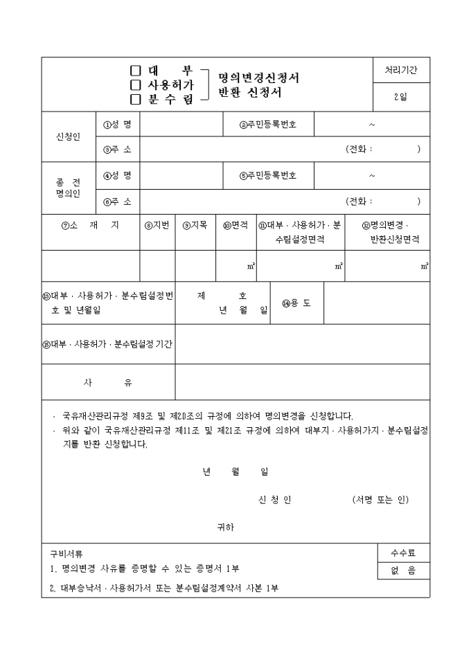 9,000원/월국유재산관리규정 제9조 및 제20조의 규정에 의하여 명의변경을 신청 / 위와 같이 국유재산관리규정 제11조 및 제21조 규정에 의하여 대부지․사용허가지․분수림설정지를 반환 신청할 때 사용하는 '(대부,사용허가,분수림)명의변경 신청서 반환신청서' 양식입니다.