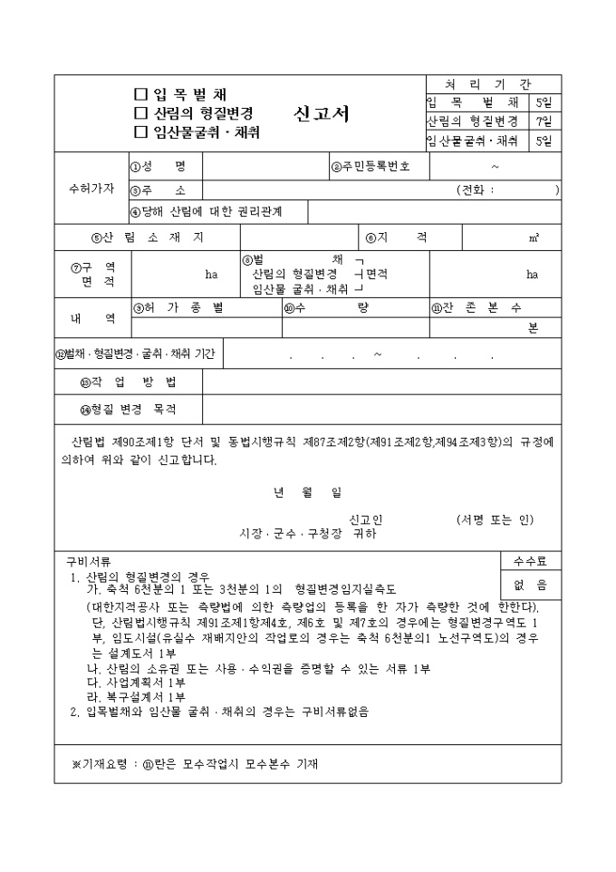 9,000원/월산림법 제90조제1항 단서 및 동법시행규칙 제87조제2항(제91조제2항,제94조제3항)의 규정에 의하여 위와 같이 신고할 때 사용하는 (입목 벌채, 산림의 형질변경, 임산 물굴취, 채취)신고서' 양식입니다.