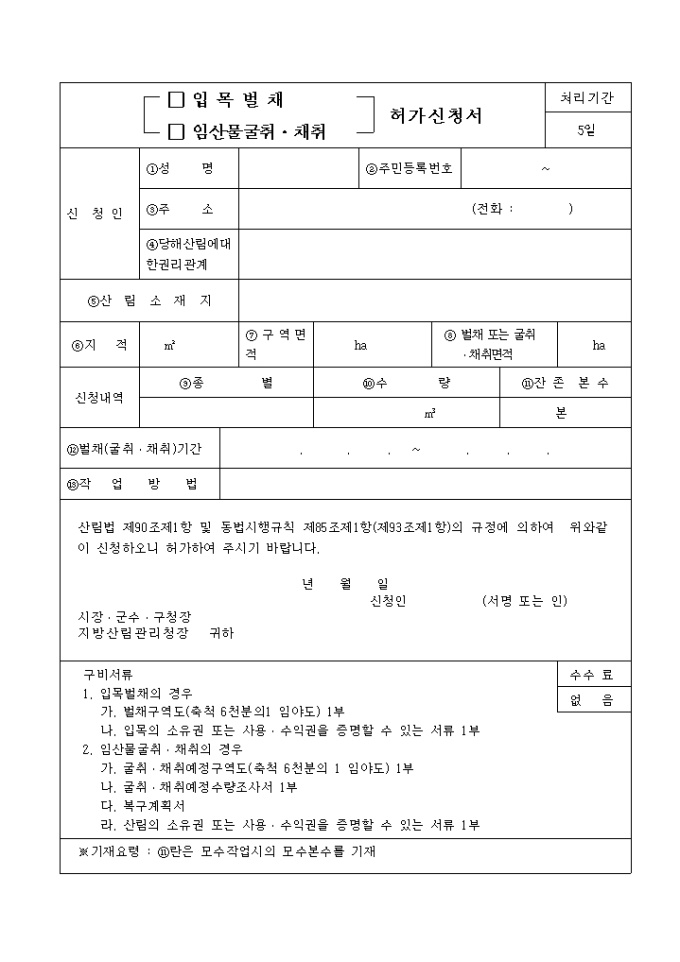 9,000원/월산림법 제90조제1항 및 동법시행규칙 제85조제1항(제93조제1항)의 규정에 의하여 위와같이 신청하오니 허가를 얻고자 할 때 사용하는 '(입목벌채, 임산물 굴취, 채취)허가신청서' 양식입니다.