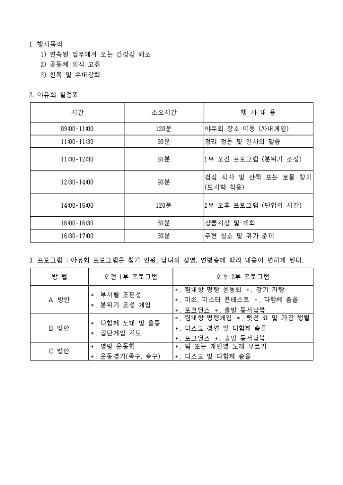 9,000원/월행사목적,야유회 일정,프로그램으로 구성된 야유회 계획표 양식입니다.