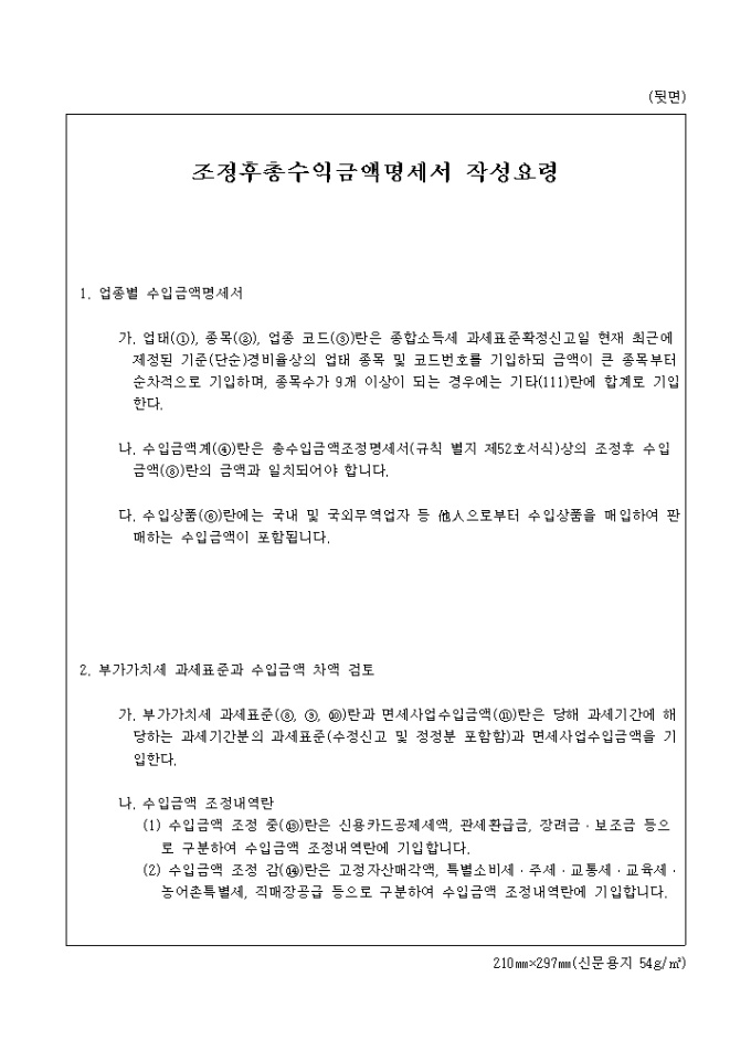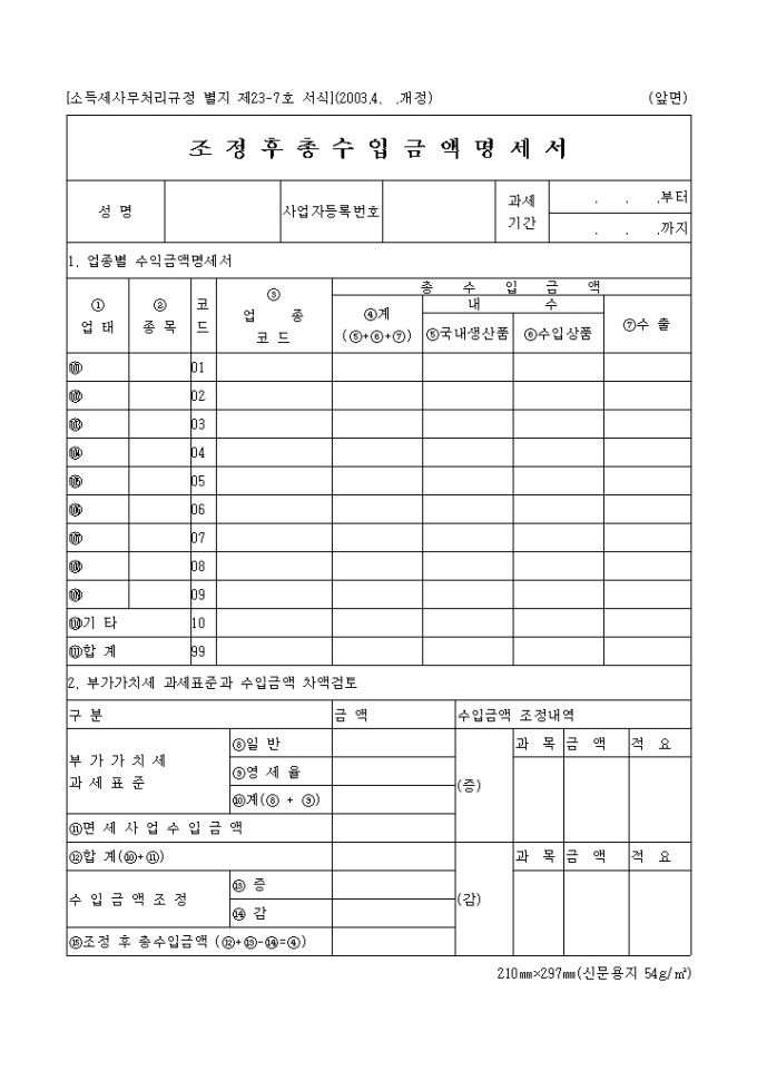 9,000원/월2003년 4월 개정 조정후총수입금액명세서 양식입니다. ..... 1. 업종별 수입금액명세서 가.업태(①), 종목(②), 업종 코드(③)란은 종합소득세 과세표준확정신고일 현재 최근에 제정된 기준(단순)경비율상의 업태 종목 및 코드번호를 기입하되 금액이 큰 종목부터 순차적으로 기입하며, 종목수가 9개 이상이 되는 경우에는 기타(111)란에 합계로 기입한다. 나. 수입금액계(④)란은 총수입금액조정명세서(규칙 별지 제52호서식)상의 조정후 수입금액(⑧)란의 금액과 일치되어야 합니다. .....
