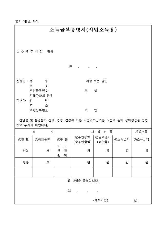 9,000원/월전년분 및 본년분의 신고, 갱정, 검정에 따른 사업소득금액은 다음과 같이 상위없음을 증명받고자 할 때 사용하는 소득금액 증명서(사업소득용) 서식입니다.