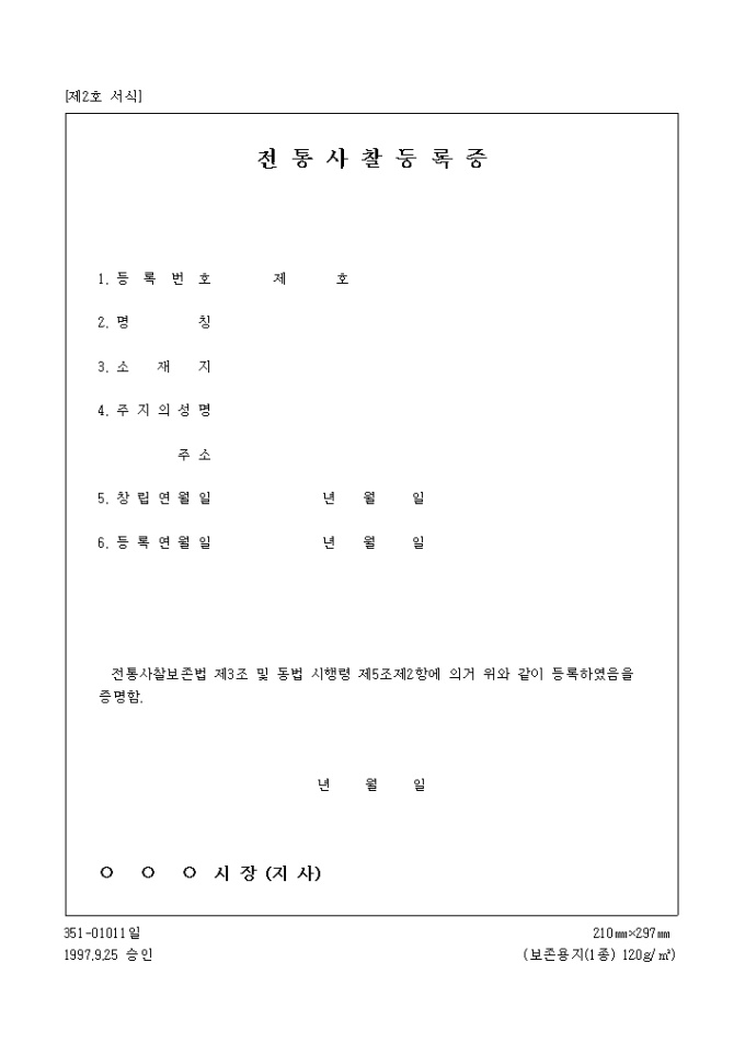 9,000원/월전통사찰보존법 제3조 및 동법 시행령 제5조제2항에 의거 위와 같이 등록하였음을 증명을 나타내는 전통사찰등록증 양식입니다.