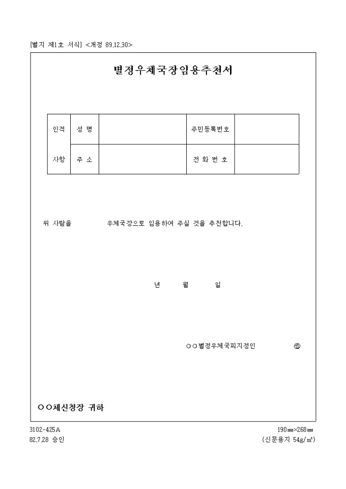 9,000원/월별정 우체국자 임용을 추천하고자 할 때 사용하는 서식입니다.