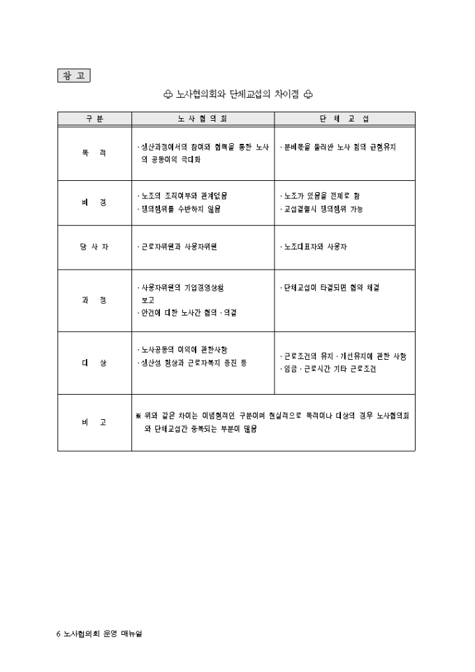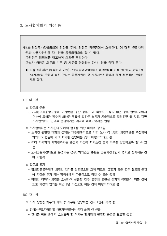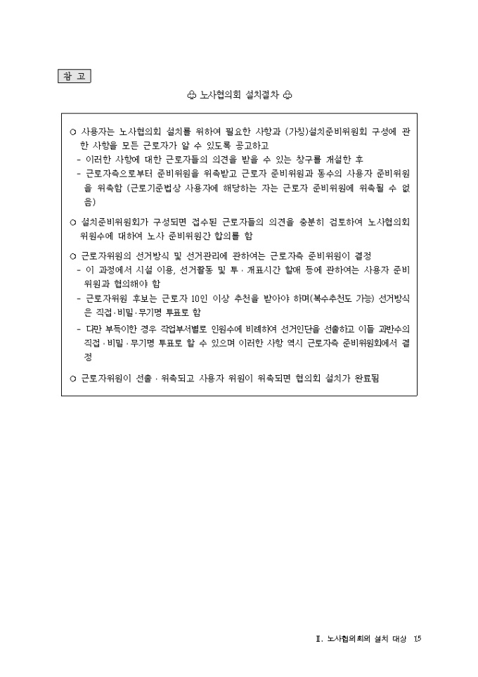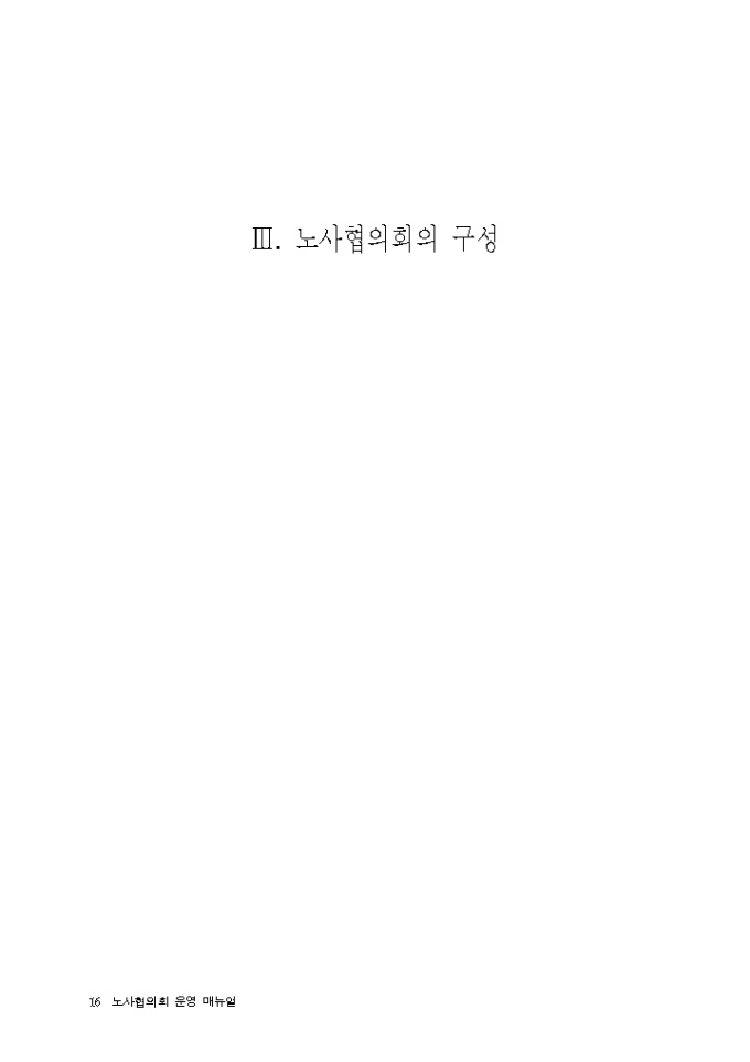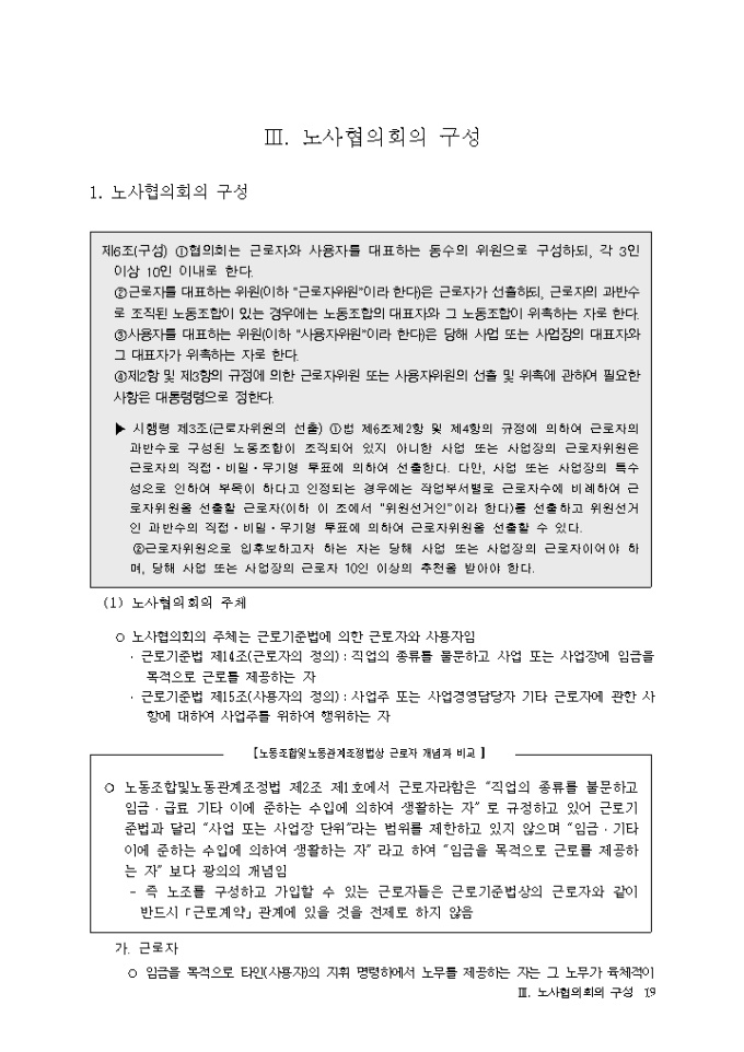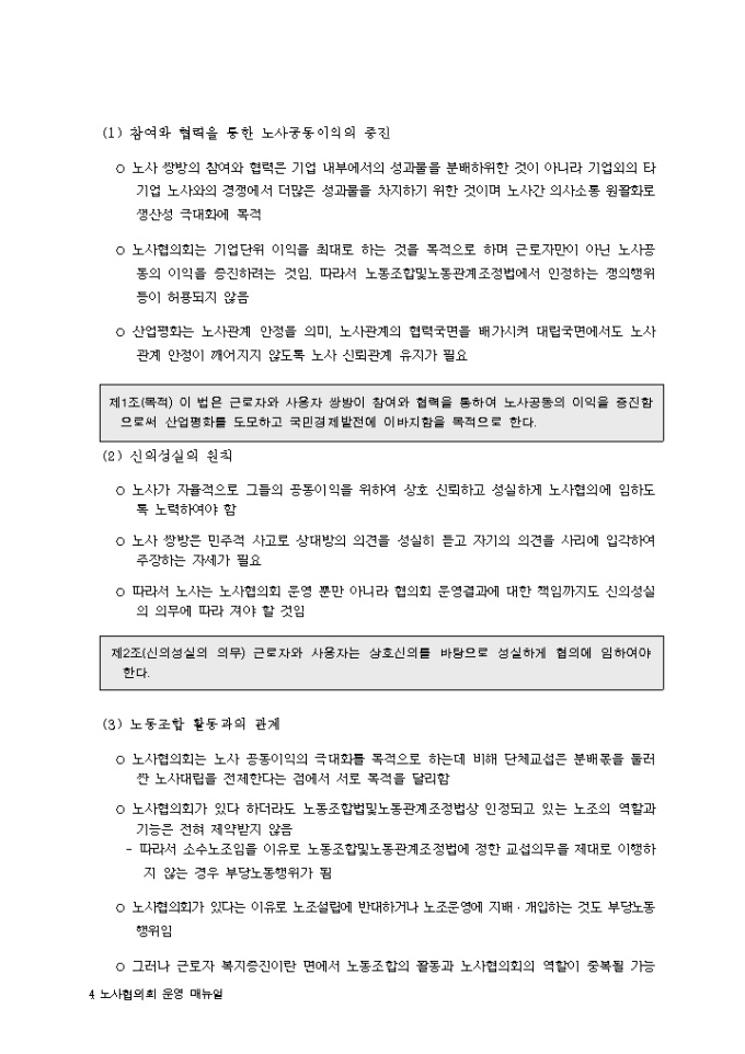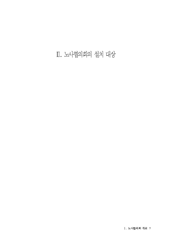 노동부에서 배포하는 노사협의회 운영 매뉴얼입니다.Ⅰ. 노사협의회 개요 Ⅱ. 노사협의회의 설치 대상 Ⅲ. 노사협의회의 구성 Ⅳ. 노사협의회의 운영 Ⅴ. 노사협의회의 임무 Ⅵ. 고충처리