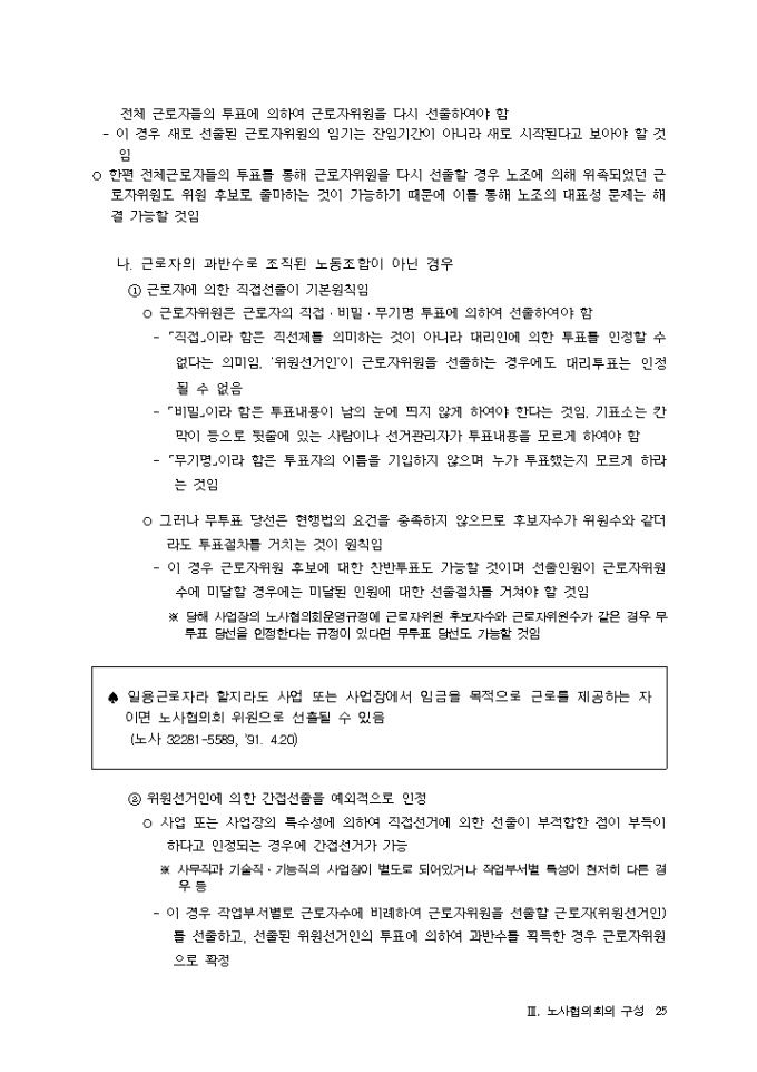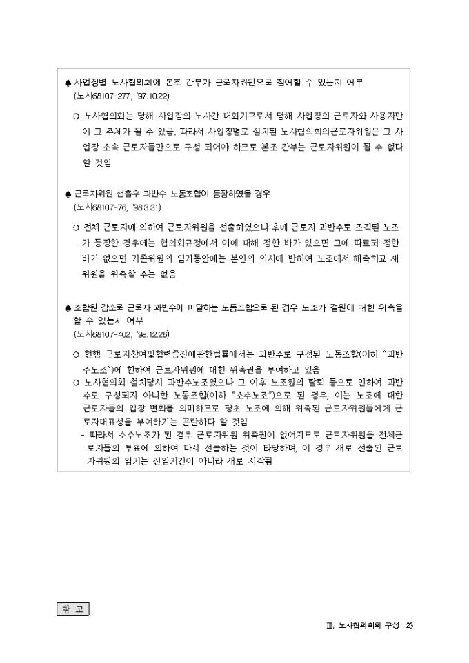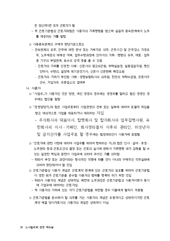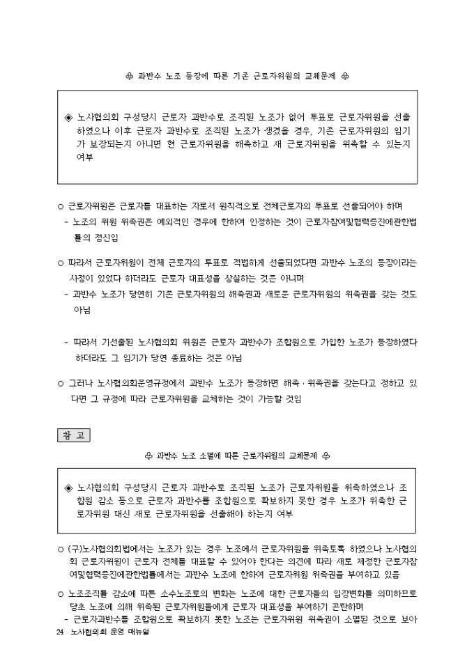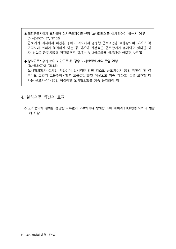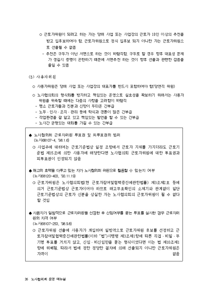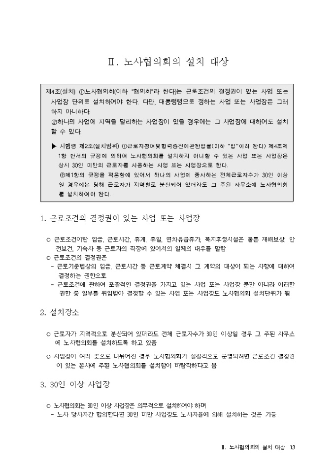노동부에서 배포하는 노사협의회 운영 매뉴얼입니다.Ⅰ. 노사협의회 개요 Ⅱ. 노사협의회의 설치 대상 Ⅲ. 노사협의회의 구성 Ⅳ. 노사협의회의 운영 Ⅴ. 노사협의회의 임무 Ⅵ. 고충처리