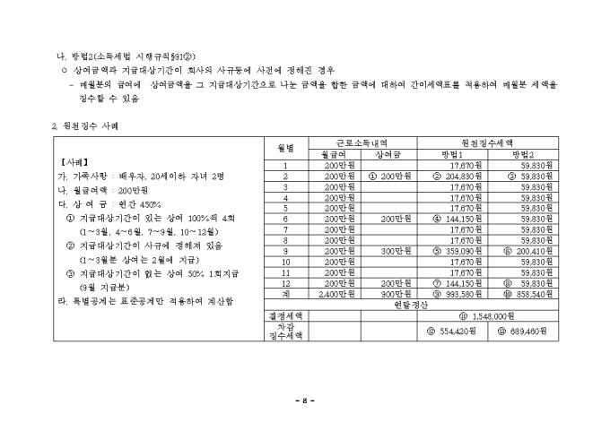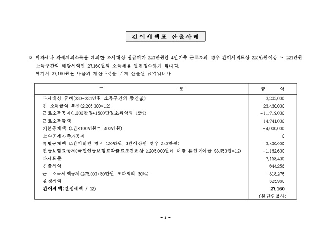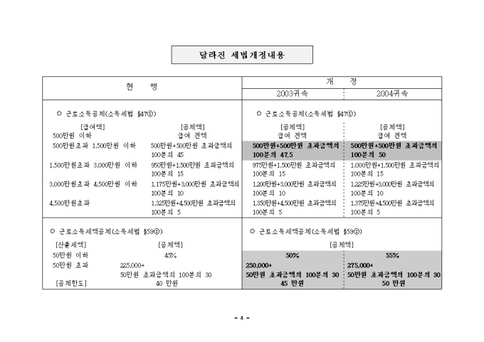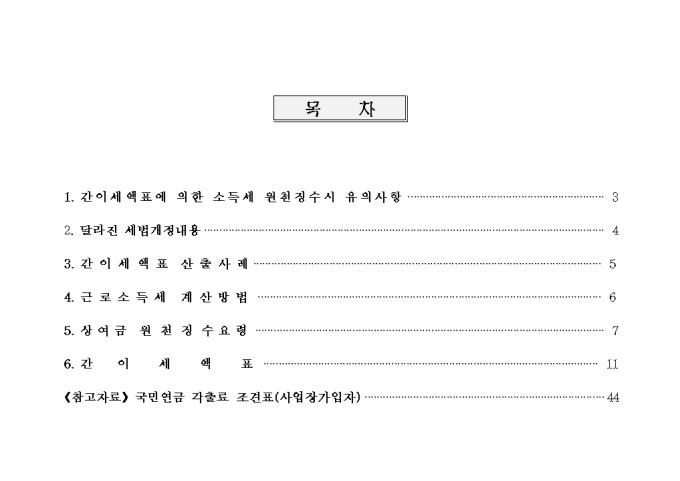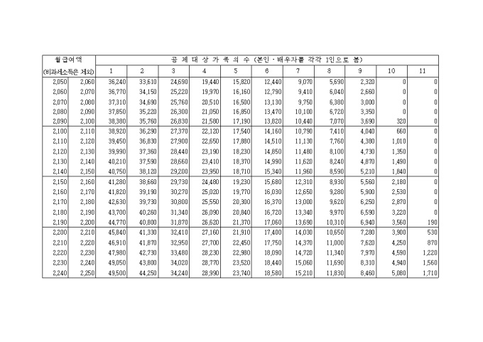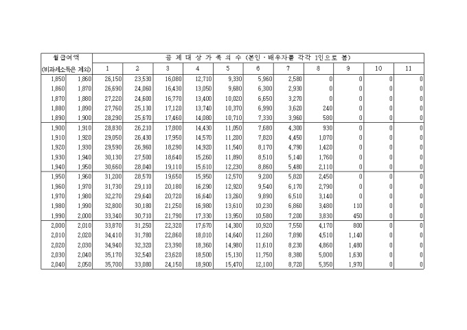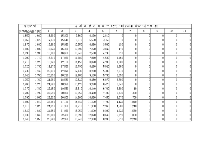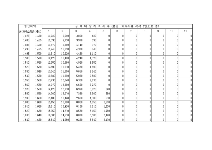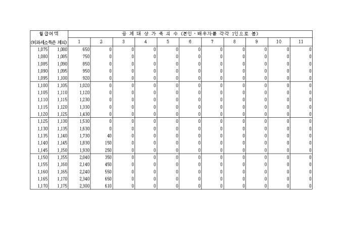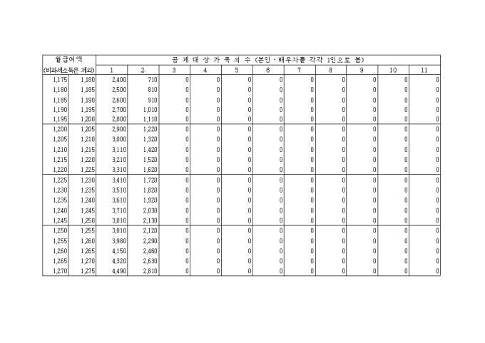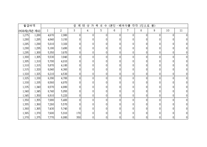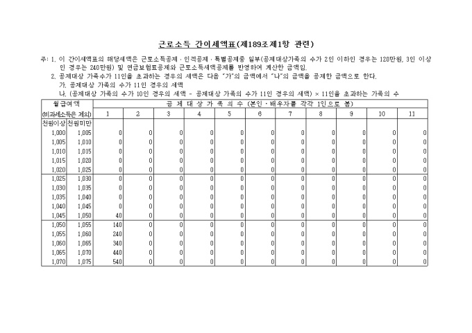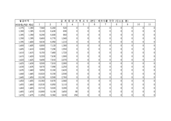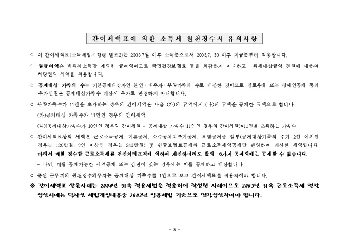 9,000원/월국세청에서 나온 2003년도 간이세액 조견표입니다. 이 간이세액표(소득세법시행령 별표2)는 2003.7월 이후 소득분으로서 2003.7. 30 이후 지급분부터 적용합니다. 월급여액은 비과세소득만 제외한 급여액이므로 국민건강보험료 등을 차감하지 아니하고 과세대상금액 전액에 대하여 해당란의 세액을 적용합니다. 공제대상 가족의 수는 기본공제대상자인 본인·배우자·부양가족의 수로 계산한 것이므로 경로우대 또는 장애인공제 등의 추가인원은 공제대상가족수 계산시 추가로 반영하지 아니합니다. 부양가족수가 11인을 초과하는 경우의 간이세액은 다음 (가)의 금액에서 (나)의 금액을 공제한 금액으로 합니다. (가)공제대상 가족수가 11인인 경우의 간이세액 (나)[공제대상가족수가 10인인 경우의 간이세액 - 공제대상 가족수 11인인 경우의 간이세액)×11인을 초과하는 가족수