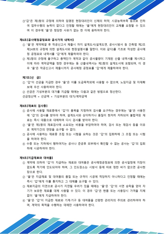 공정표, 선금, 재료검사, 지급재료, 시공도면