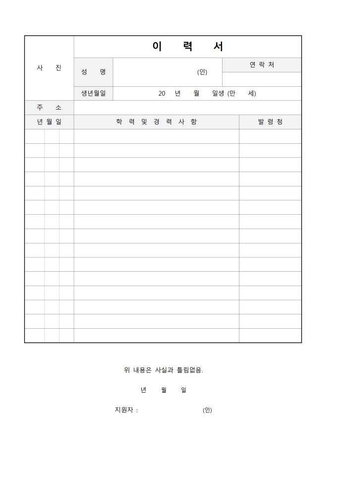 9,000원/월회사에 지원하기 위한 표준 인사서식1호 이력서입니다. 사진, 성명, 연락처, 생년월일, 주소, 학력 및 경력사항, 발령청 등으로 구성되어 있습니다.