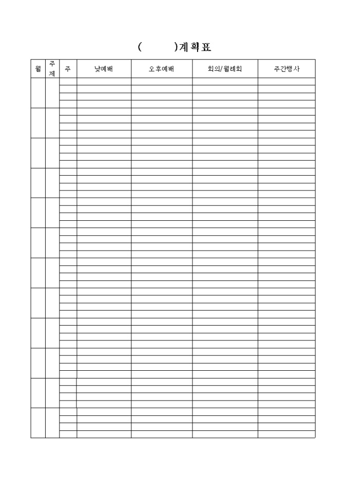 9,000원/월낮예배,오후예배,월례회,주간행사등을 기록하는 계획표입니다.