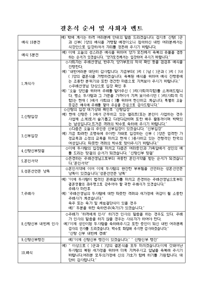 9,000원/월개식사 및 신랑입장, 신부입장, 신랑신부 맞절 등 결혼식 순서 및 사회자 멘트 양식입니다.