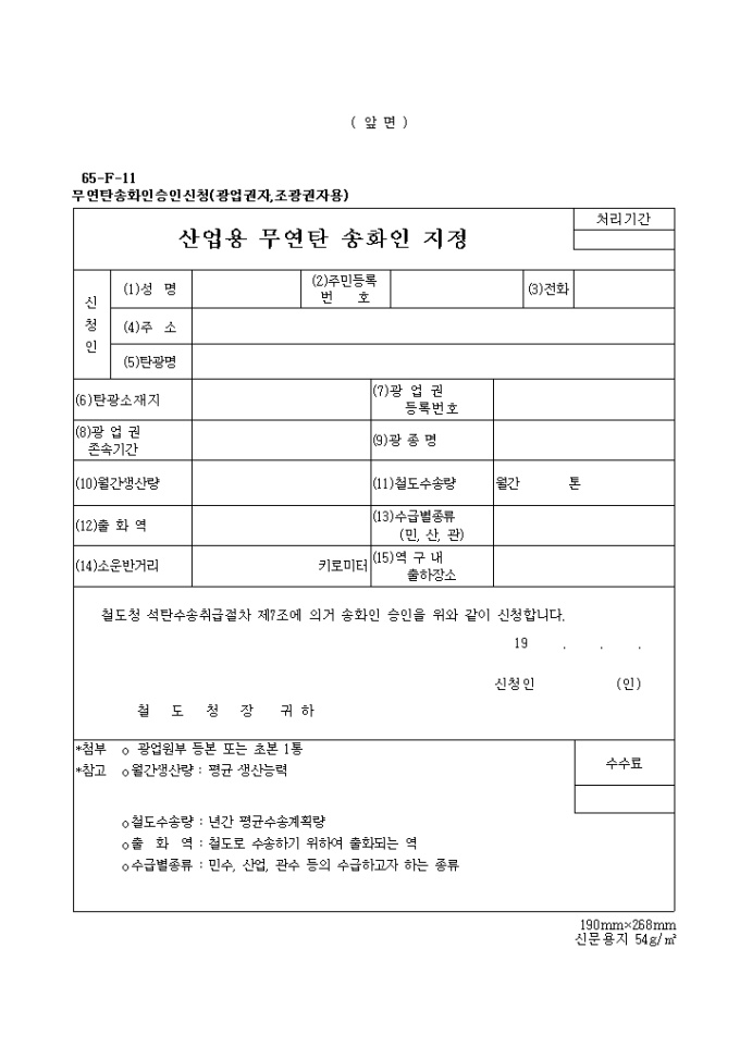 9,000원/월철도청 석탄수송취급절차 제7조에 의거 송화인 승인을 위와 같이 신청하고자 할 때 사용하는 산업용무 연탄 송화인지정 양식입니다.