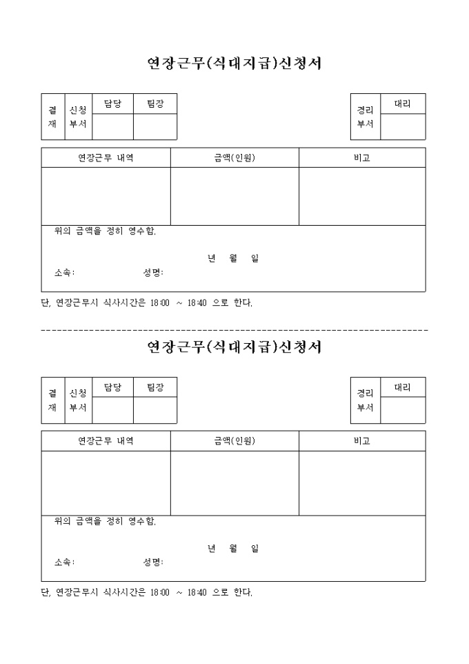 9,000원/월연장근무시 식대지급 요청을 위한 신청서입니다. 연장근무 내역, 인원수 등을 기록합니다.