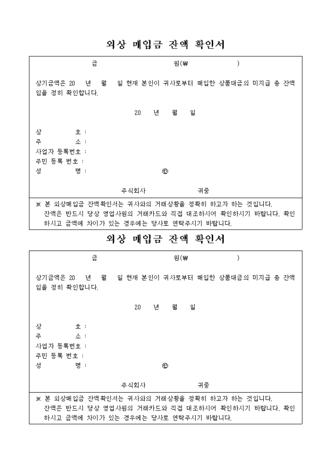 업체간 외상금액에 대한 확인시 사용하는 양식입니다.