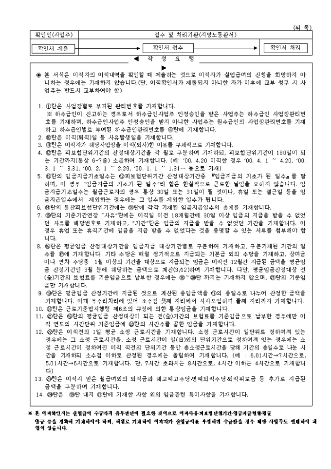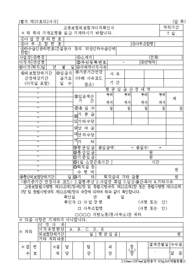 9,000원/월고용보험법시행령 제10조제1항·제2항 및 동법시행규칙 제12조제1항 또는 동법시행령 제10조제3항 및 동법시행규칙 제12조제2항의 규정에 의하여 고용보험 피보험자 이직 확인시 사용하는 양식입니다.