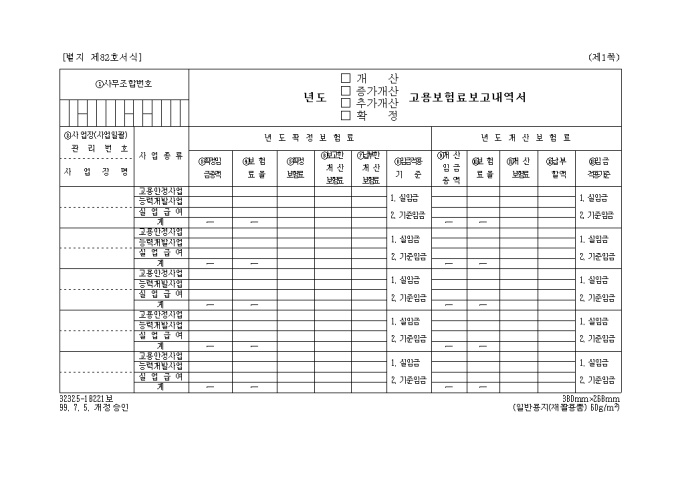 9,000원/월년도별 개산, 증가개산, 추가개산, 확정 고용보험료보고내역서 양식입니다. 사업장 관리번호, 사업종류, 년도확정보험료, 년도 개산보험료등의 항목으로 구성되어 있습니다.