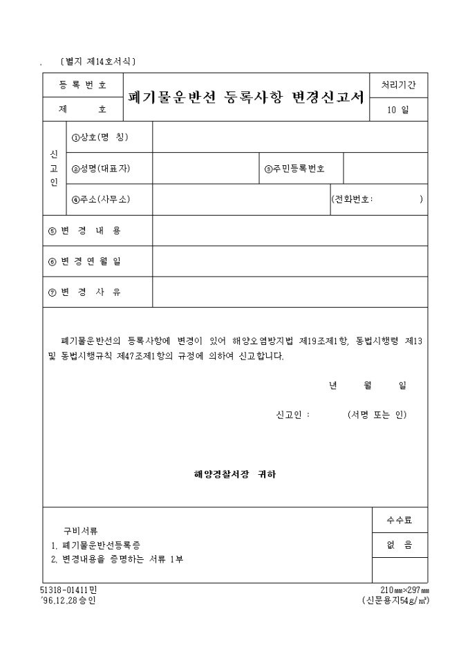9,000원/월폐기물운반선의 등록사항에 변경이 있어 해양오염방지법 제19조제1항, 동법시행령 제13 및 동법시행규칙 제47조제1항의 규정에 의하여 신고할 때 사용하는 폐기물 운반선 등록사항 변경신고서 양식입니다.