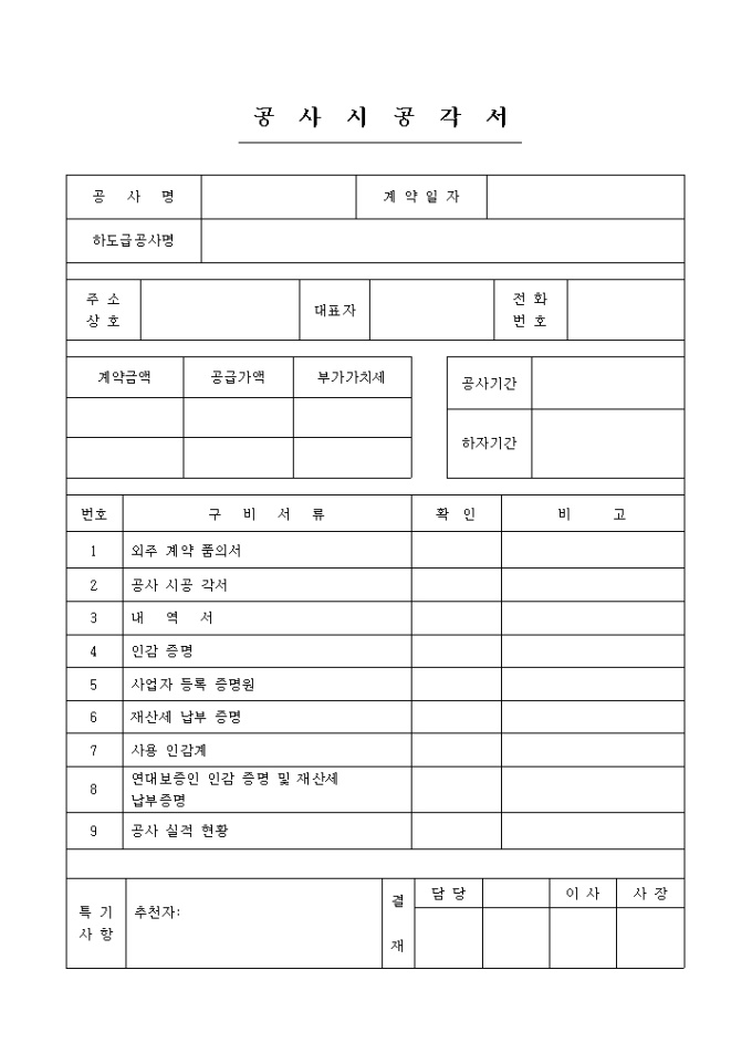 9,000원/월공사명, 계약일자, 하도급공사명, 주소, 상호, 대표자, 전화번호, 계약금액, 공급가액, 부가가치세, 공사기간, 하자기간, 구비서류 등 공사시공에 관한 공사시공각서 양식입니다.