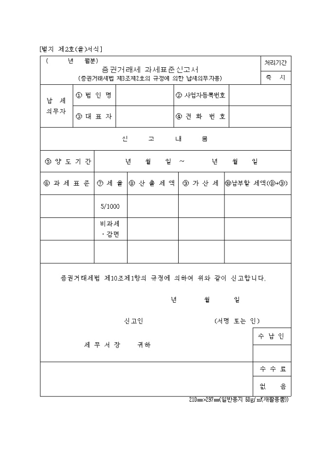 9,000원/월증권거래세법 제3조제2호의 규정에 의한 납세의무자용 증권거래세과세표준신고서(증권회사용)입니다.