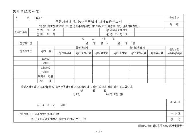 9,000원/월증권거래세법 제3조제1호 및 농어촌특별세법 제3조제4호의 규정에 의한 납세의무자용 증권거래세및농어촌특별세과세표준신고서(증권예탁용)입니다.