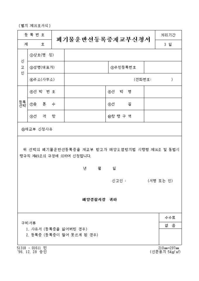 9,000원/월위 선박의 폐기물운반선등록증을 재교부 받고자 해양오염방지법 시행령 제14조 및 동법시행규칙 제49조의 규정에 의하여 신청할 때 사용하는 폐기물 운반선 등록증 재교부신청서 양식입니다.